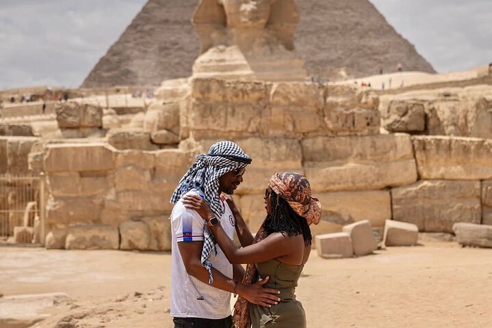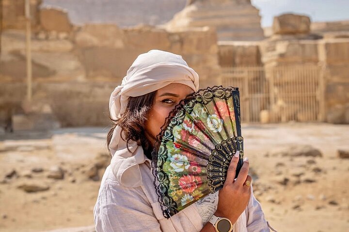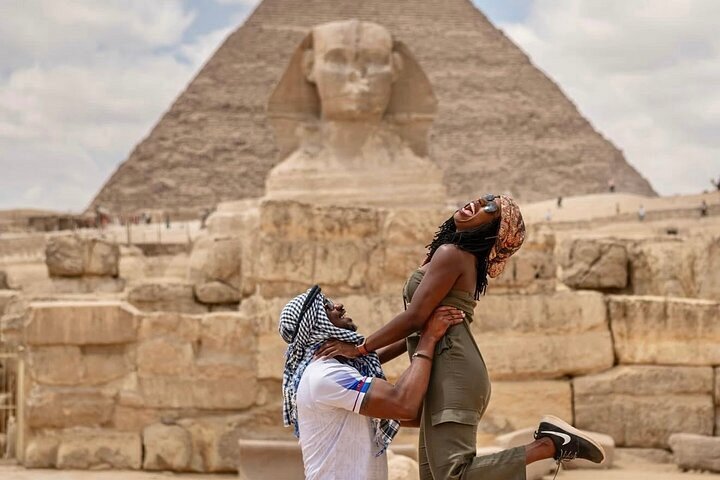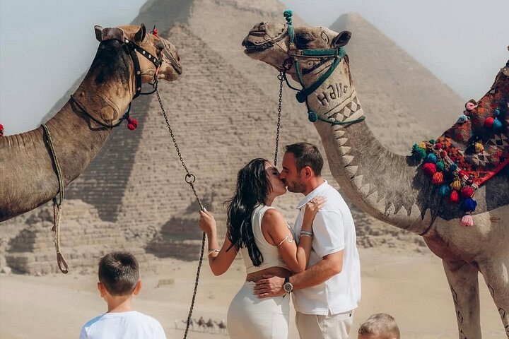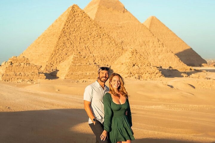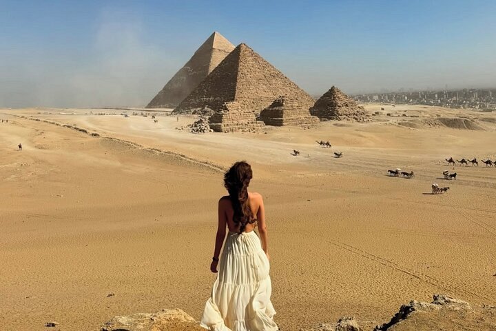 기자의 피라미드 단지로 이동하면 쿠푸 대왕의 피라미드와 카프레, 멘카우레의 피라미드를 볼 수 있으며, 고대 세계 7대 불가사의 중 하나인 이 가장 웅장한 장소에서 멋진 사진을 찍을 수 있습니다.